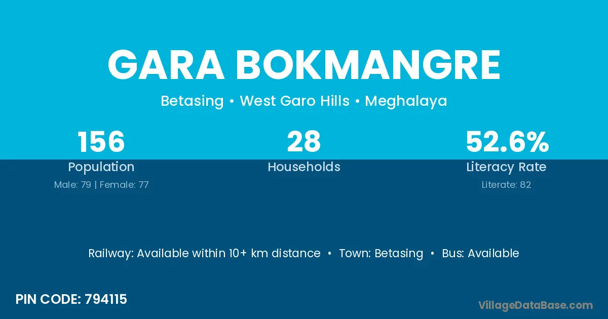 Gara Bokmangre village has a total population of 156 people, of which 79 are males and 77 are females.