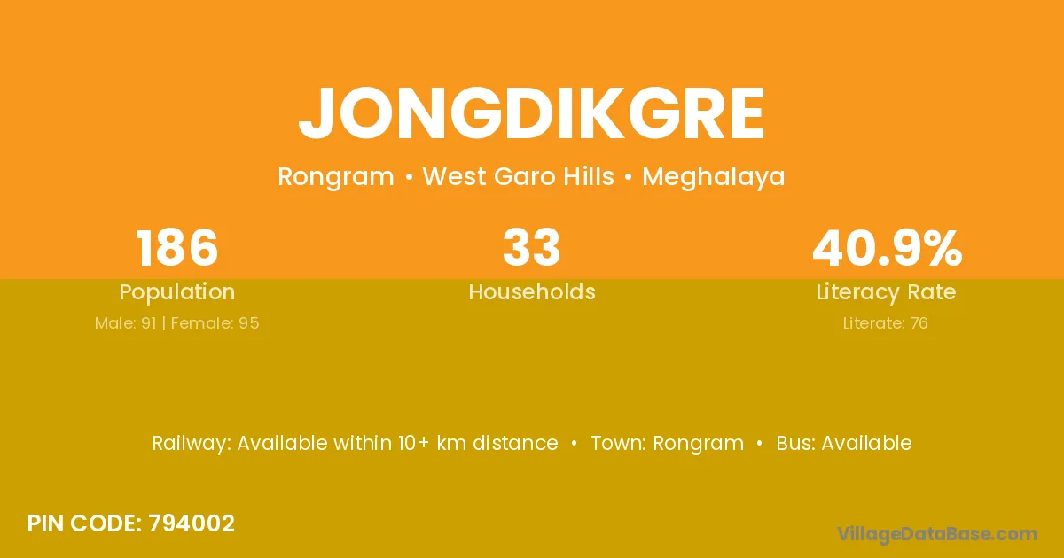 The literacy rate of Jongdikgre village is 29.32%. Male literacy stands at 39.05% and female literacy at 17.44%.