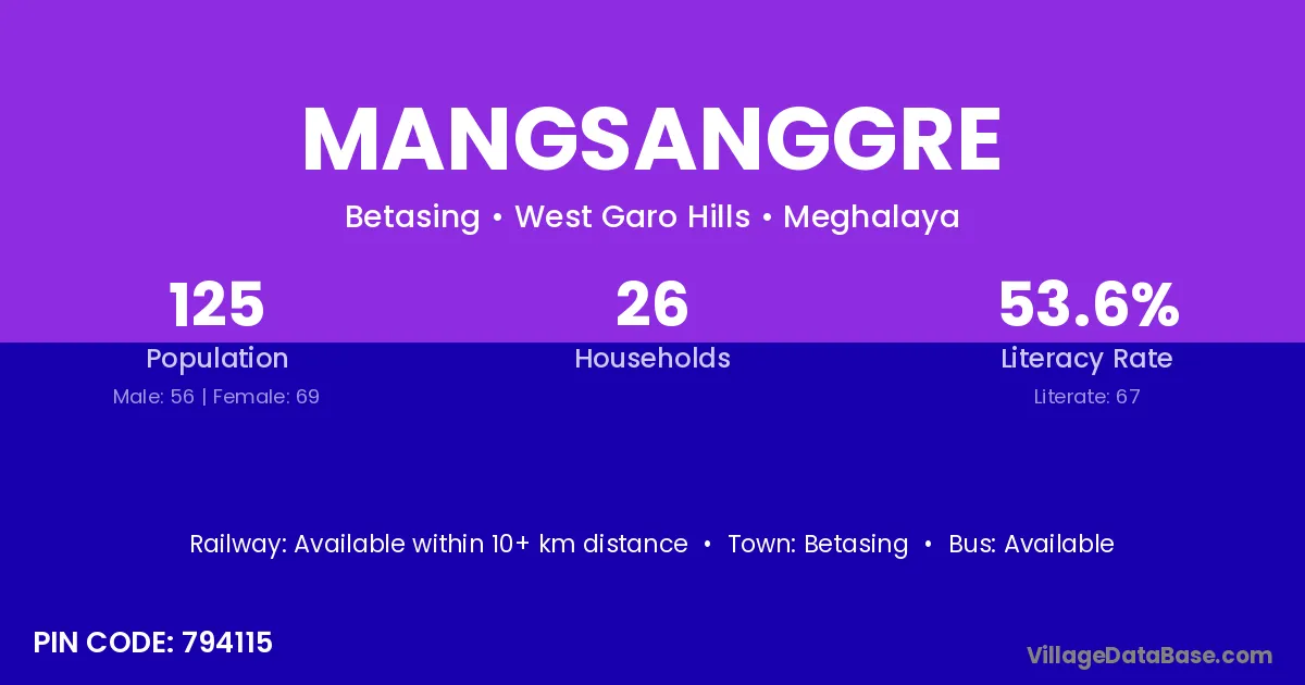 The literacy rate of Mangsanggre village is 53.60%. Male literacy stands at 62.50% and female literacy at 46.38%.