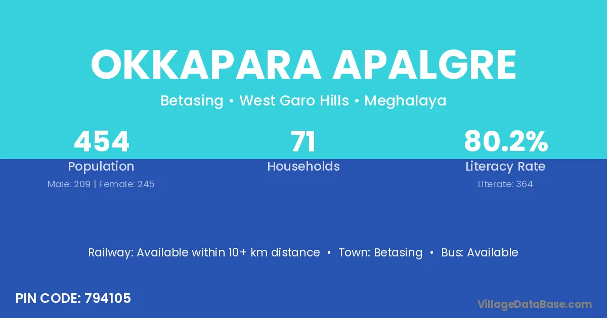 Okkapara Apalgre village has a total population of 454 people, of which 209 are males and 245 are females.