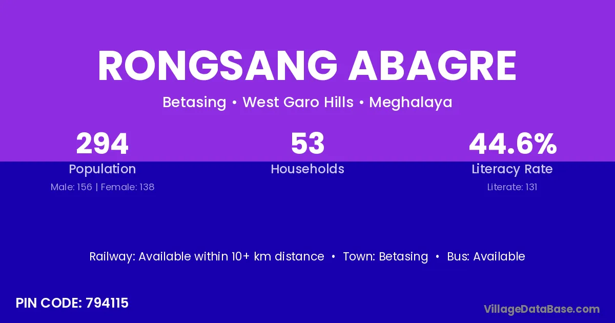 Rongsang Abagre village has a total population of 294 people, of which 156 are males and 138 are females.