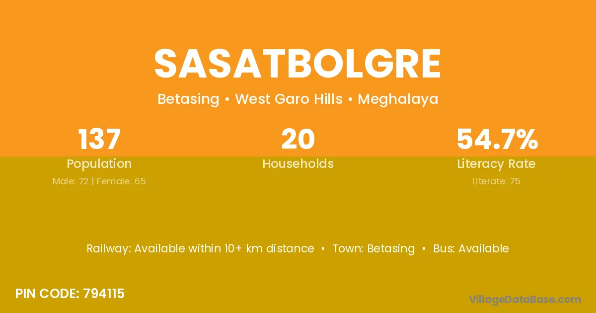 The literacy rate of Sasatbolgre village is 54.74%. Male literacy stands at 54.17% and female literacy at 55.38%.