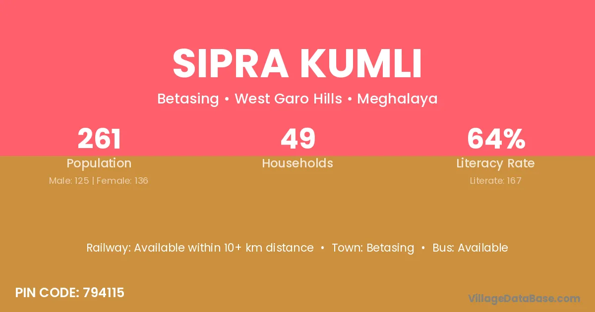 Sipra Kumli village has a total population of 261 people, of which 125 are males and 136 are females.