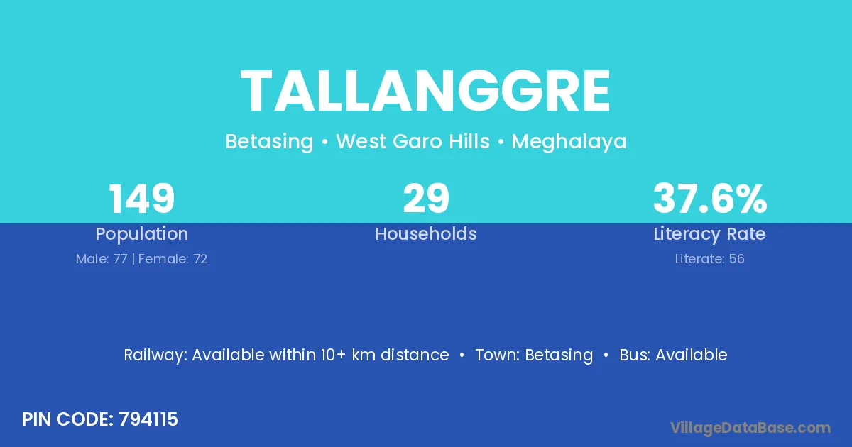 Tallanggre village has a total population of 149 people, of which 77 are males and 72 are females.