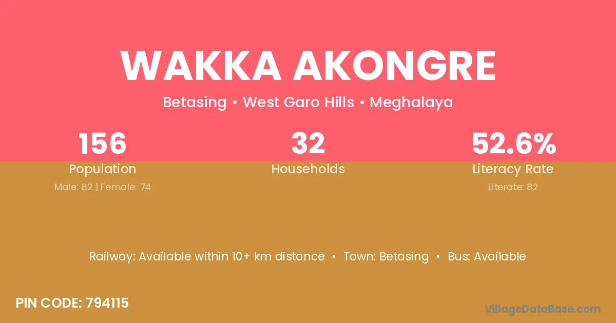 Wakka Akongre village has a total population of 156 people, of which 82 are males and 74 are females.