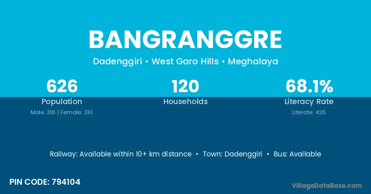 Bangranggre village has a total population of 626 people, of which 316 are males and 310 are females.