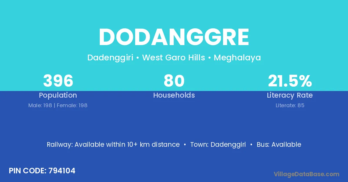 The literacy rate of Dodanggre village is 21.46%. Male literacy stands at 30.81% and female literacy at 12.12%.
