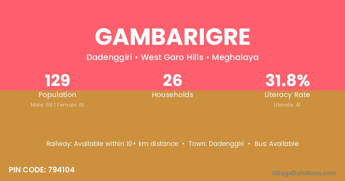 Gambarigre village has a total population of 129 people, of which 68 are males and 61 are females.