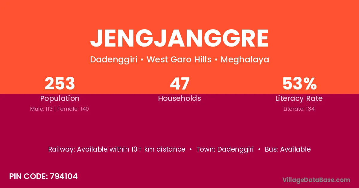 Jengjanggre village has a total population of 253 people, of which 113 are males and 140 are females.