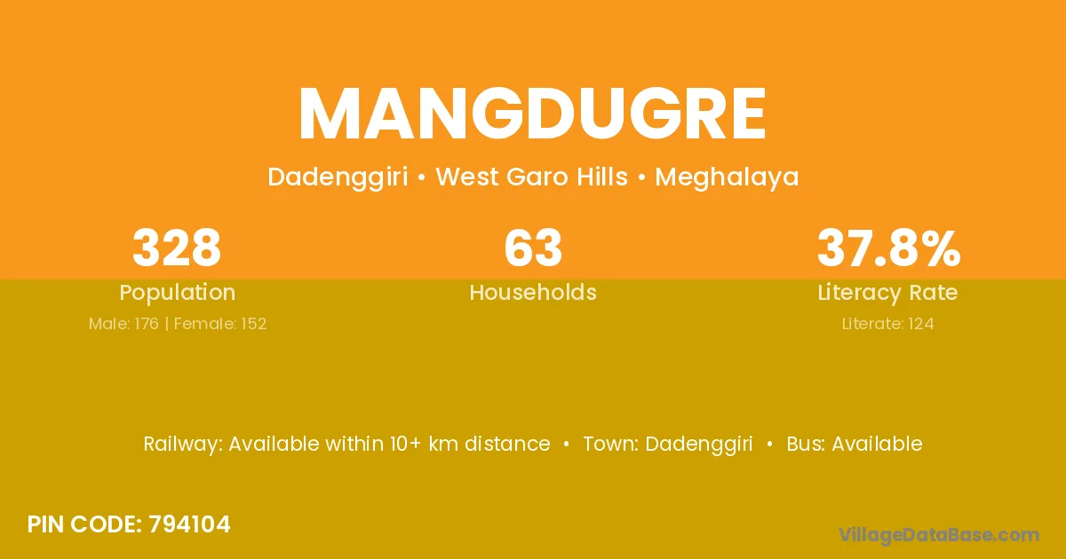 Mangdugre village has a total population of 328 people, of which 176 are males and 152 are females.