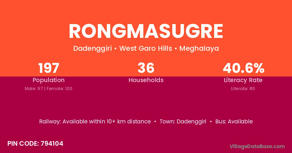 Rongmasugre village has a total population of 197 people, of which 97 are males and 100 are females.