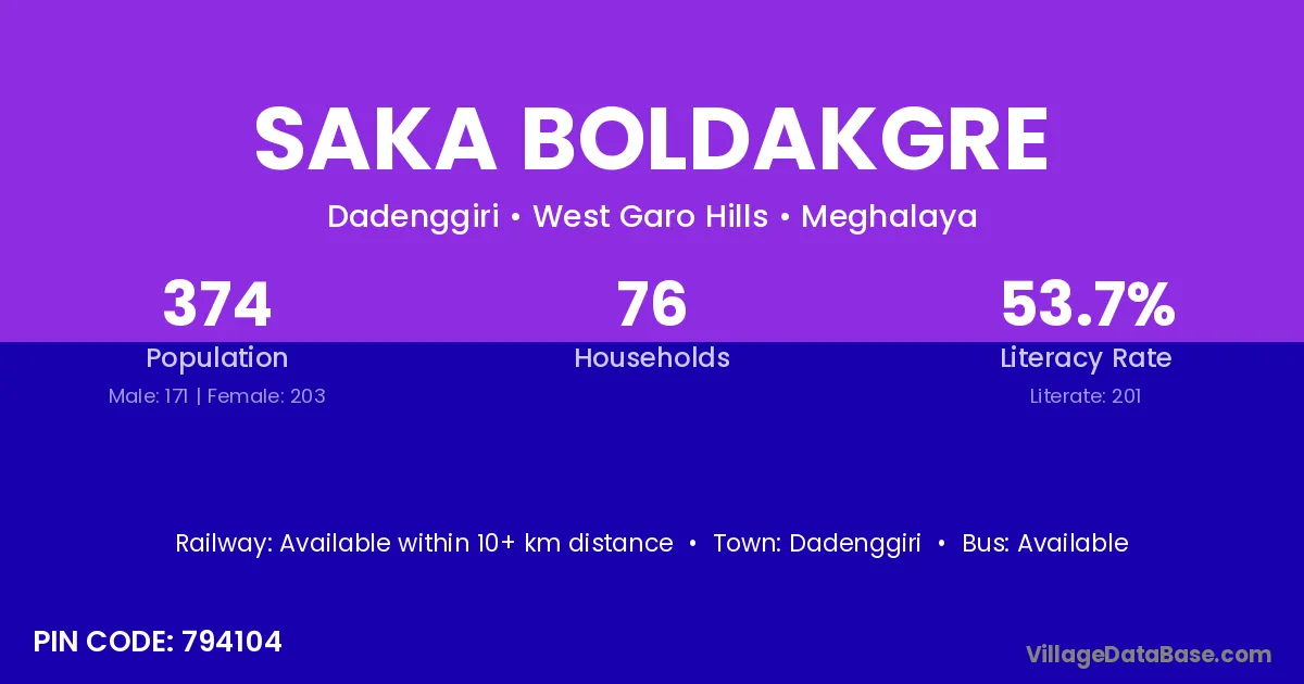 Saka Boldakgre village has a total population of 374 people, of which 171 are males and 203 are females.