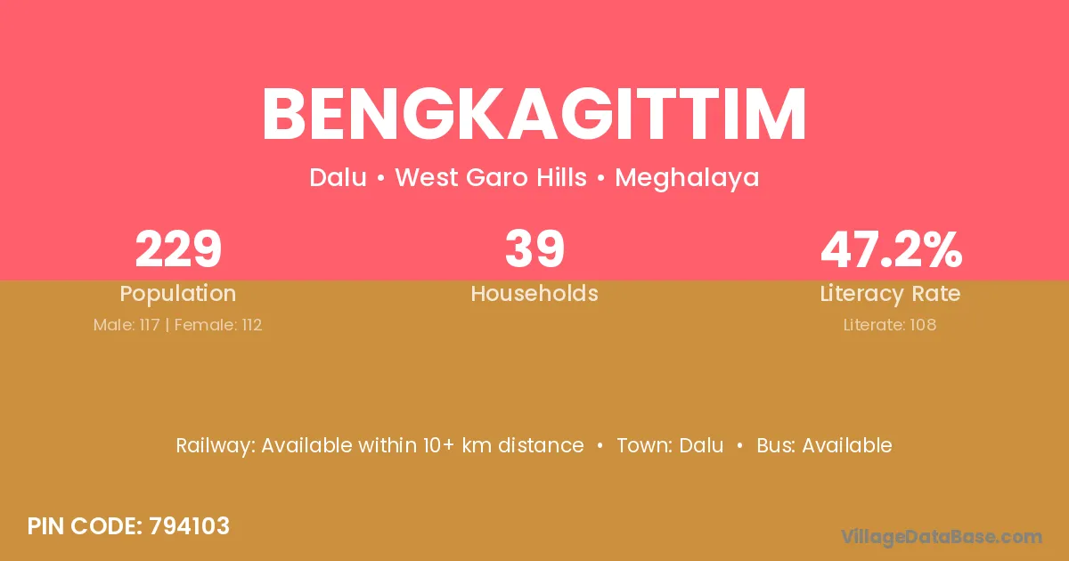 The literacy rate of Bengkagittim village is 47.16%. Male literacy stands at 47.86% and female literacy at 46.43%.