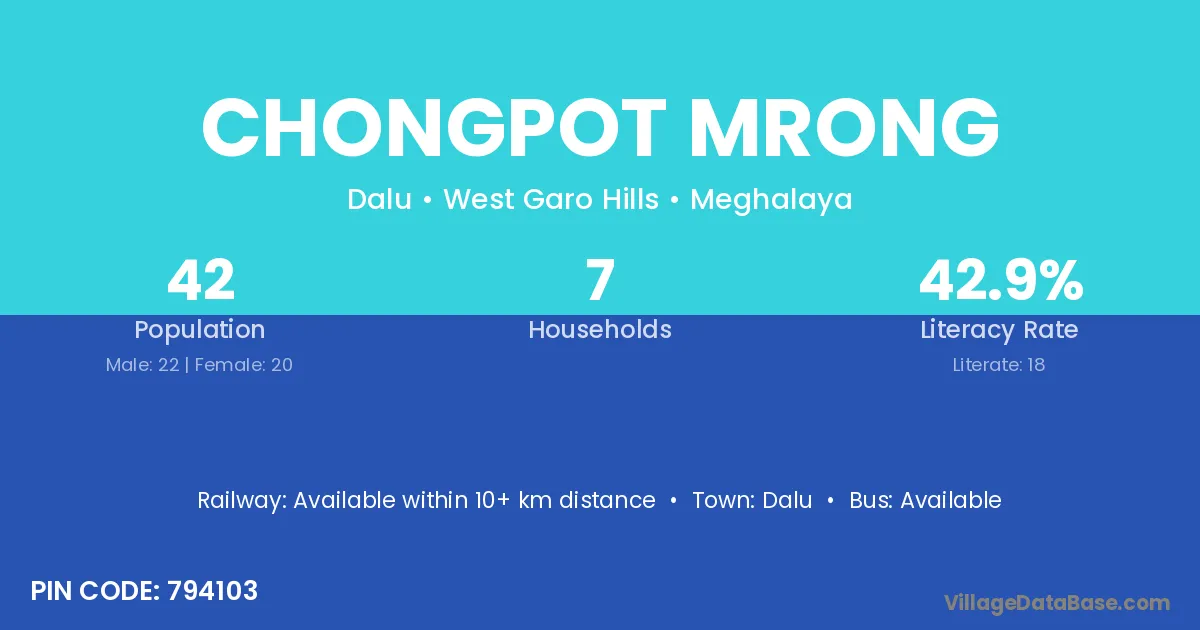 Chongpot Mrong village has a total population of 42 people, of which 22 are males and 20 are females.