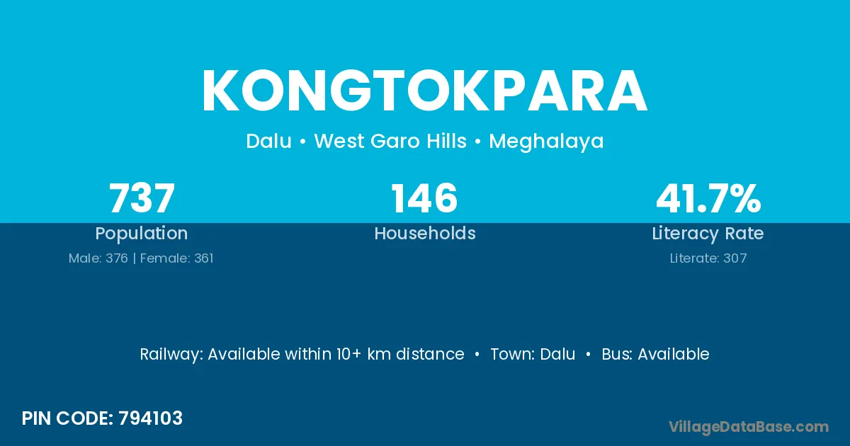 Kongtokpara village has a total population of 737 people, of which 376 are males and 361 are females.