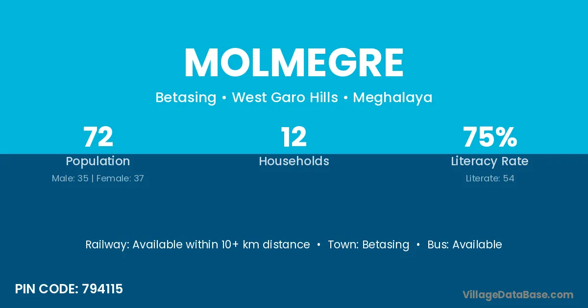 The literacy rate of Molmegre village is 48.98%. Male literacy stands at 48.05% and female literacy at 50.00%.