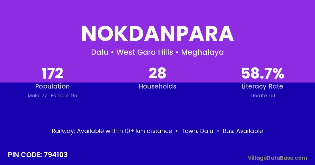 Nokdanpara village has a total population of 172 people, of which 77 are males and 95 are females.