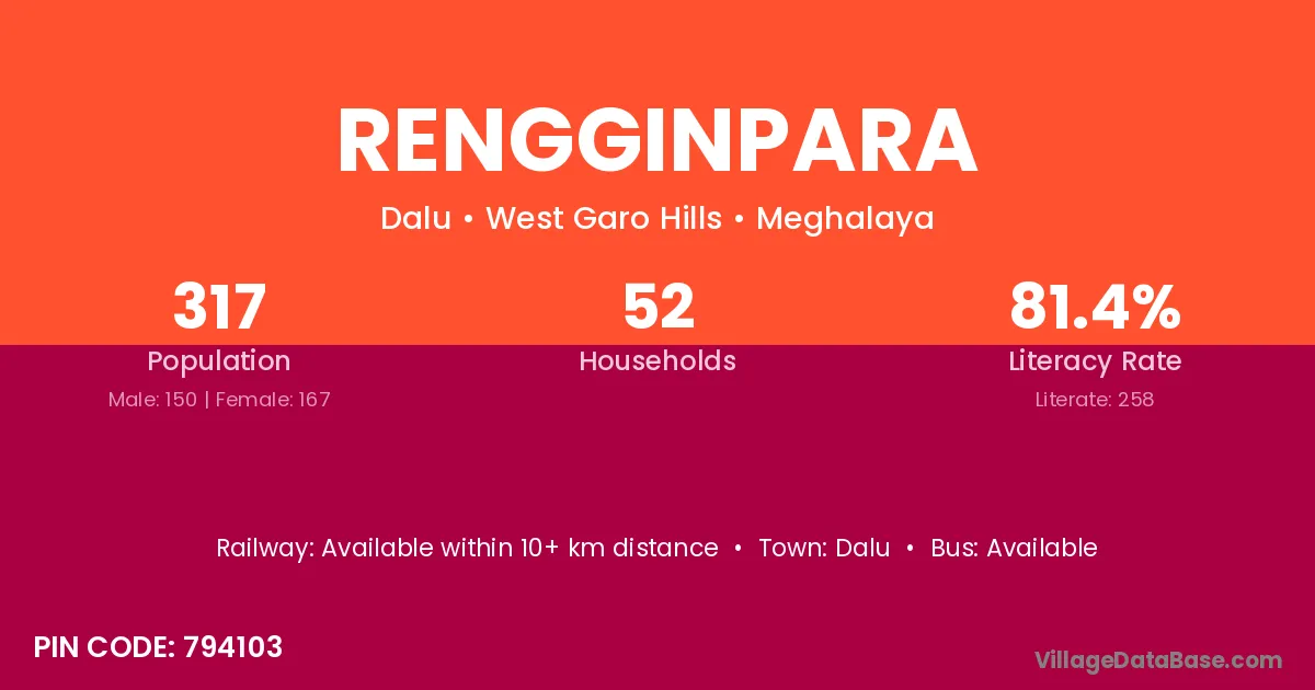 Rengginpara village has a total population of 317 people, of which 150 are males and 167 are females.