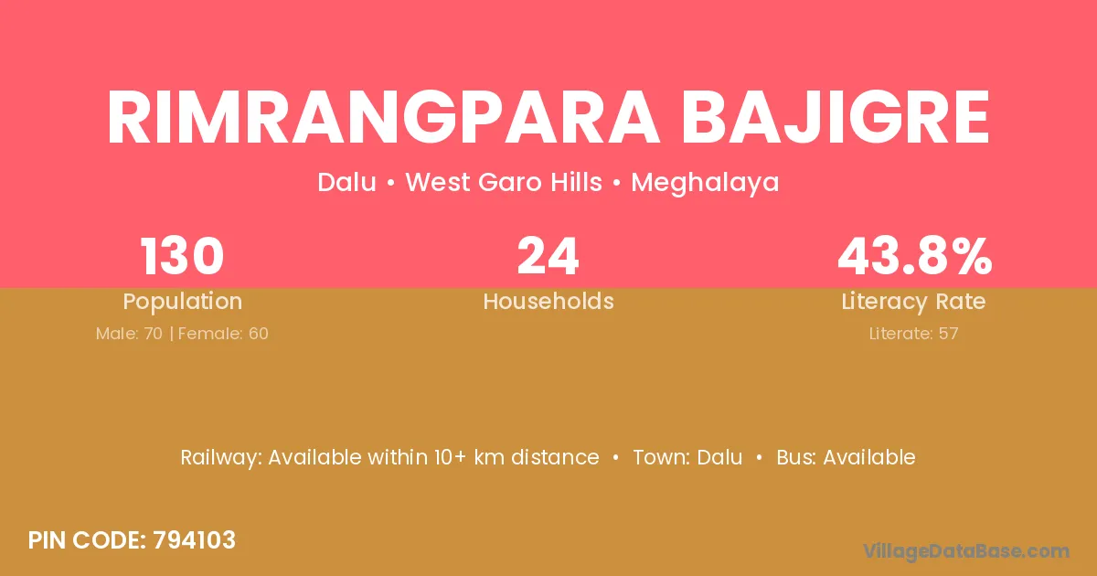 Rimrangpara Bajigre village has a total population of 130 people, of which 70 are males and 60 are females.