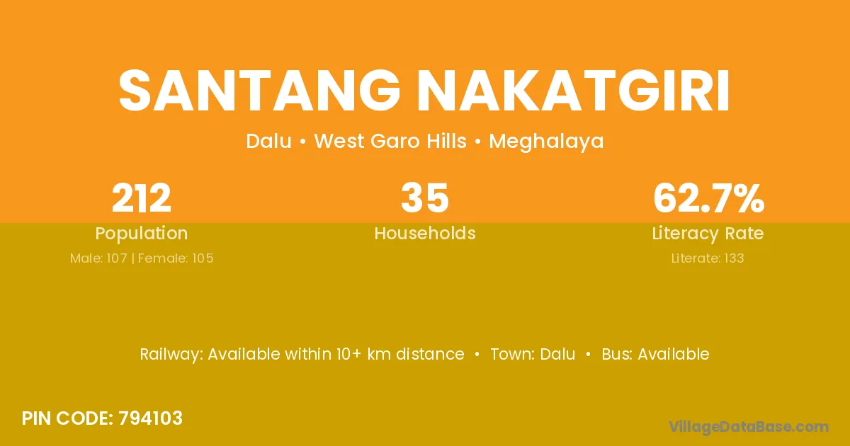 Santang Nakatgiri village has a total population of 212 people, of which 107 are males and 105 are females.