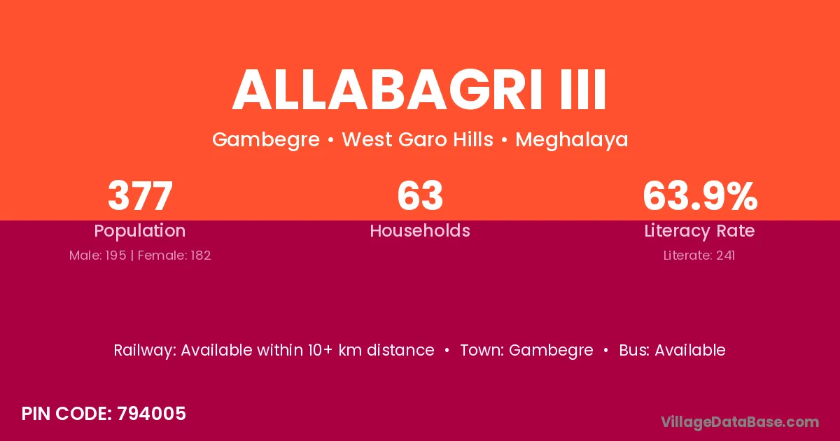 Allabagri Iii village has a total population of 377 people, of which 195 are males and 182 are females.