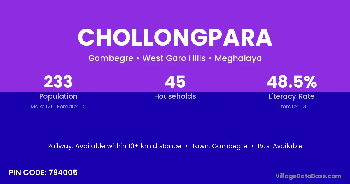 Chollongpara village has a total population of 233 people, of which 121 are males and 112 are females.