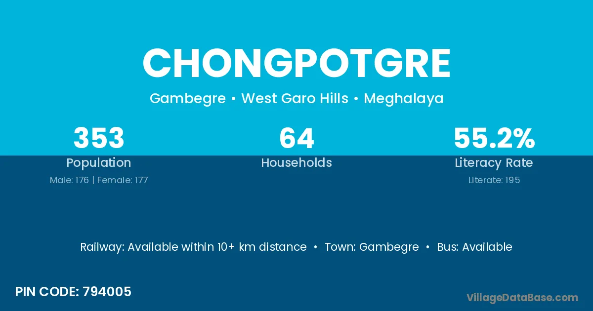 Chongpotgre village has a total population of 353 people, of which 176 are males and 177 are females.