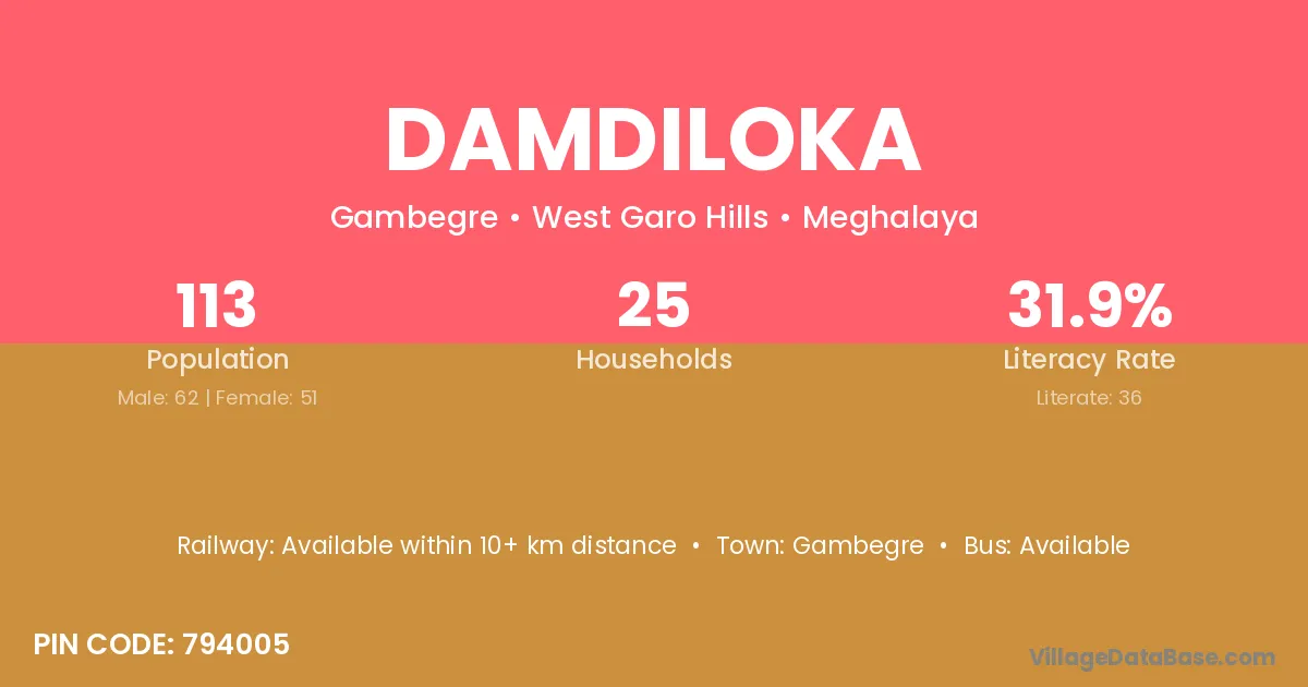 Damdiloka village has a total population of 113 people, of which 62 are males and 51 are females.