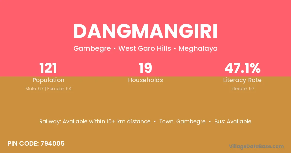 Dangmangiri village has a total population of 121 people, of which 67 are males and 54 are females.