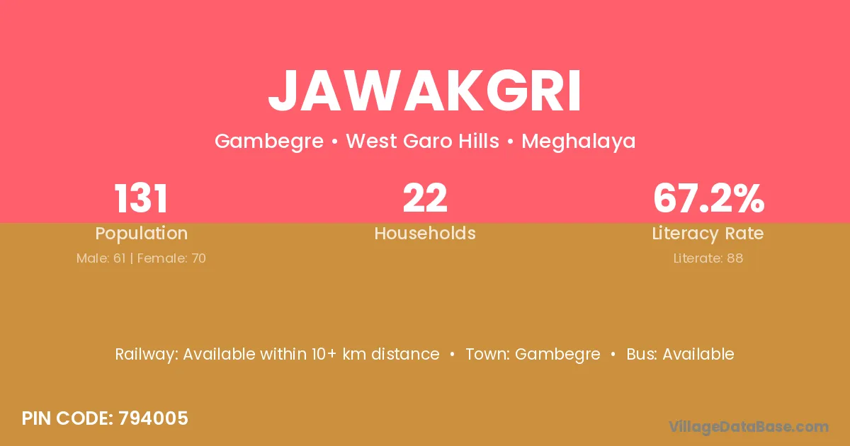 Jawakgri village has a total population of 131 people, of which 61 are males and 70 are females.