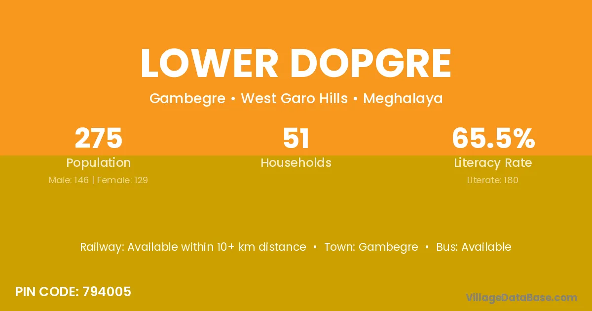 The literacy rate of Lower Dopgre village is 65.45%. Male literacy stands at 69.86% and female literacy at 60.47%.