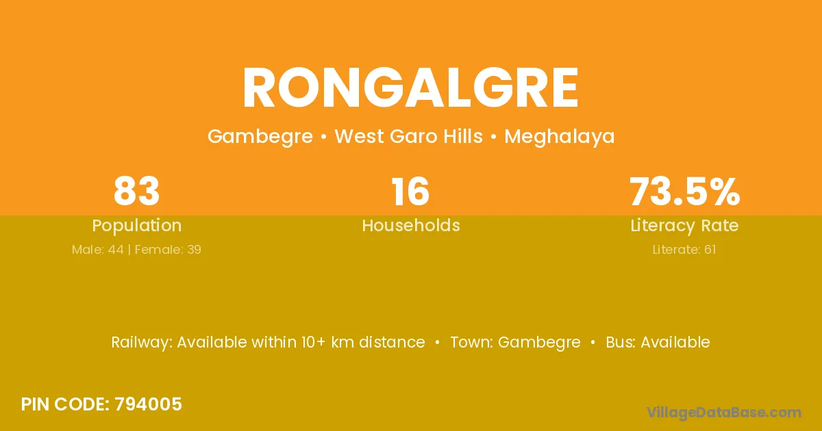 Rongalgre village has a total population of 83 people, of which 44 are males and 39 are females.