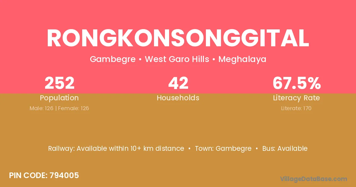 Rongkonsonggital village has a total population of 252 people, of which 126 are males and 126 are females.