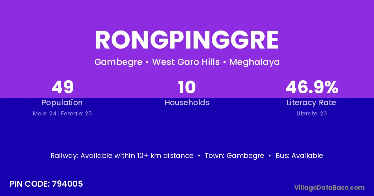 Rongpinggre village has a total population of 49 people, of which 24 are males and 25 are females.