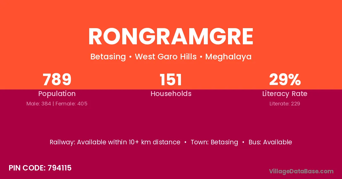 The literacy rate of Rongramgre village is 70.83%. Male literacy stands at 71.43% and female literacy at 70.00%.
