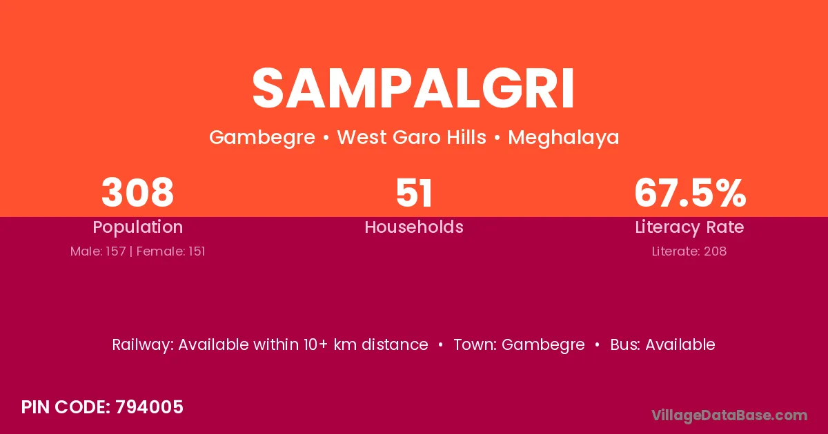 Sampalgri village has a total population of 308 people, of which 157 are males and 151 are females.