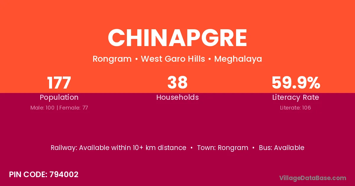 Chinapgre village has a total population of 177 people, of which 100 are males and 77 are females.