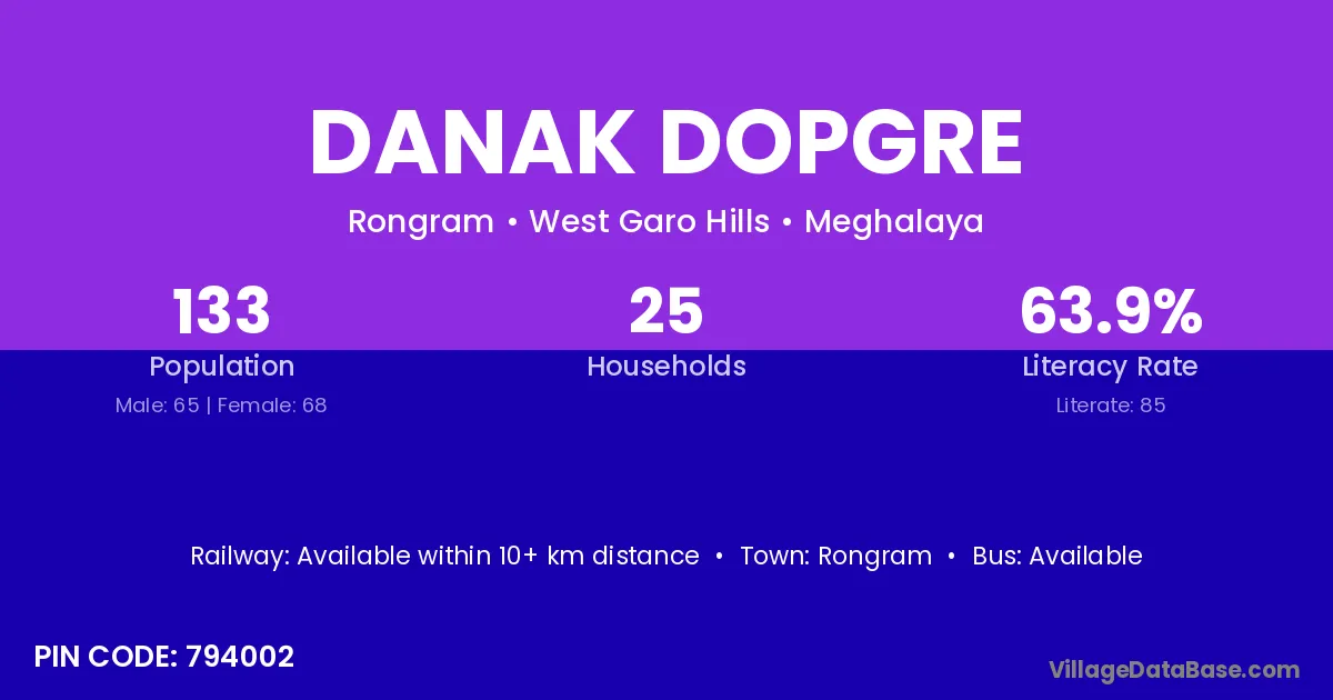 Danak Dopgre village has a total population of 133 people, of which 65 are males and 68 are females.