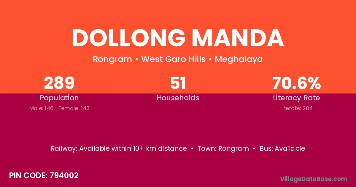 Dollong Manda village has a total population of 289 people, of which 146 are males and 143 are females.