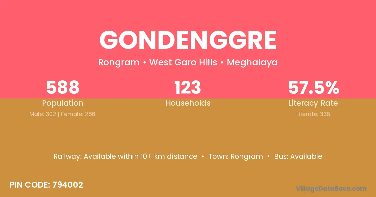 Gondenggre village has a total population of 588 people, of which 302 are males and 286 are females.