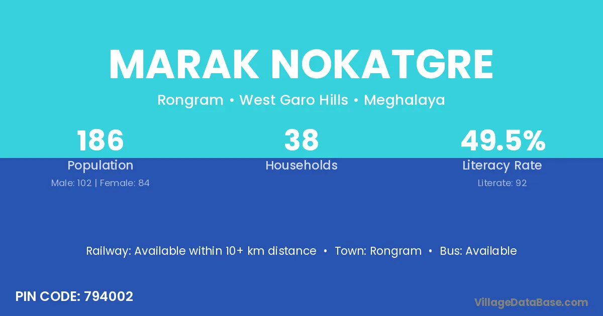 Marak Nokatgre village has a total population of 186 people, of which 102 are males and 84 are females.