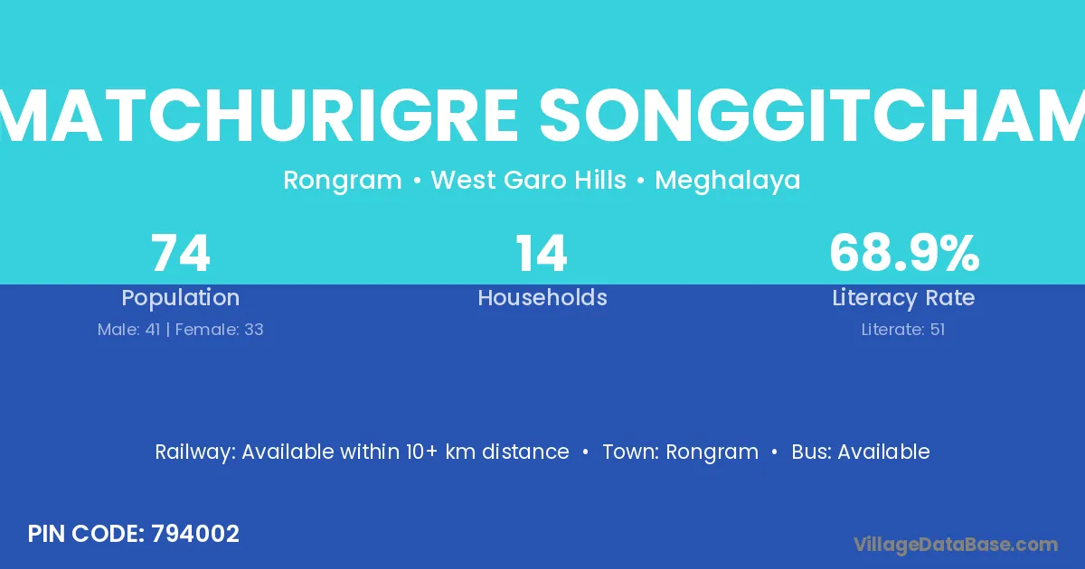 Matchurigre Songgitcham village has a total population of 74 people, of which 41 are males and 33 are females.