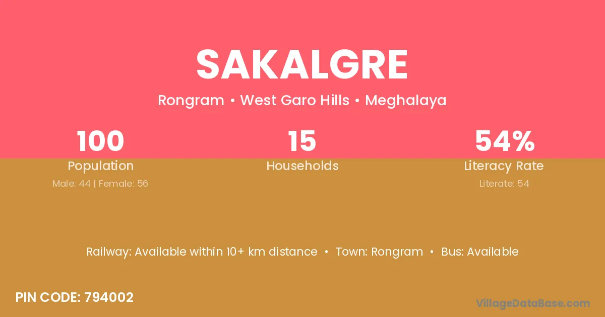 Sakalgre village has a total population of 100 people, of which 44 are males and 56 are females.