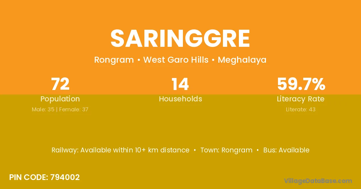 Saringgre village has a total population of 72 people, of which 35 are males and 37 are females.