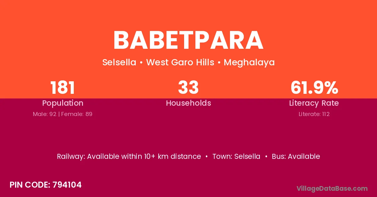 Babetpara village has a total population of 181 people, of which 92 are males and 89 are females.