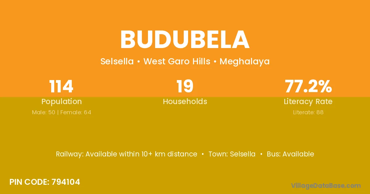 Budubela village has a total population of 114 people, of which 50 are males and 64 are females.