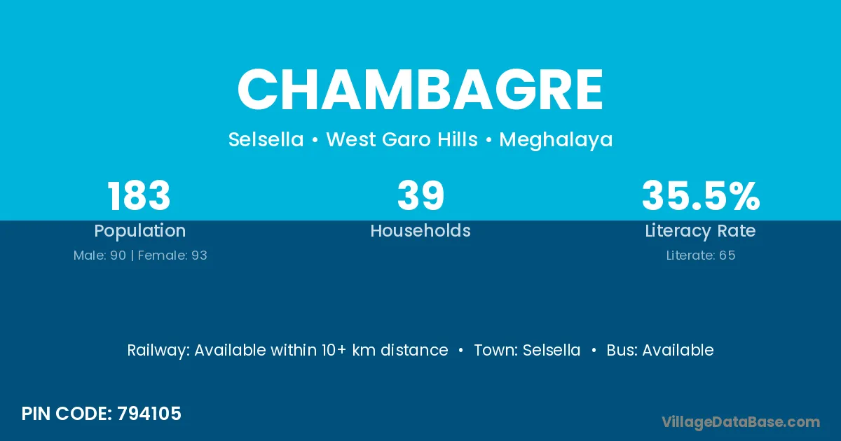 Chambagre village has a total population of 183 people, of which 90 are males and 93 are females.