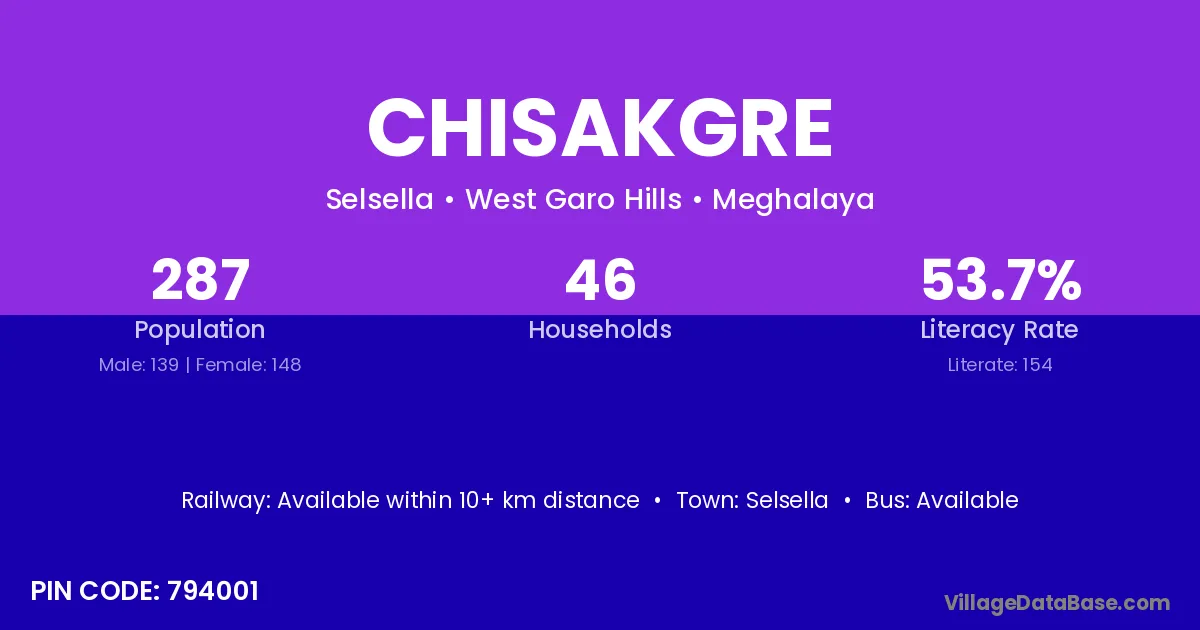 Chisakgre village has a total population of 287 people, of which 139 are males and 148 are females.