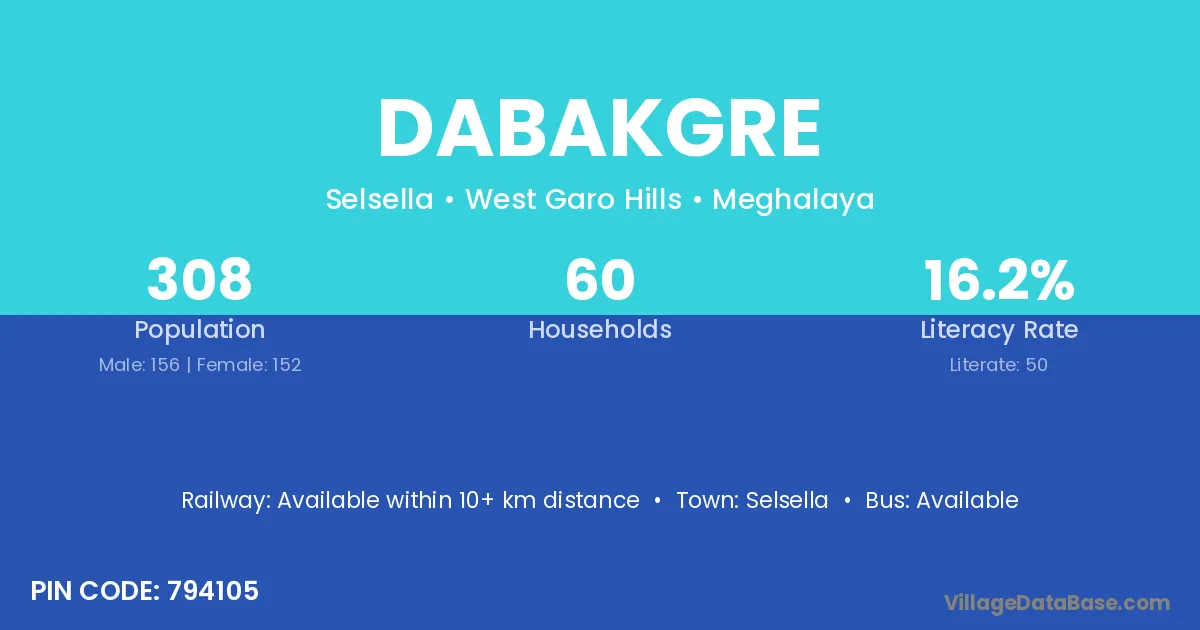 Dabakgre village has a total population of 308 people, of which 156 are males and 152 are females.