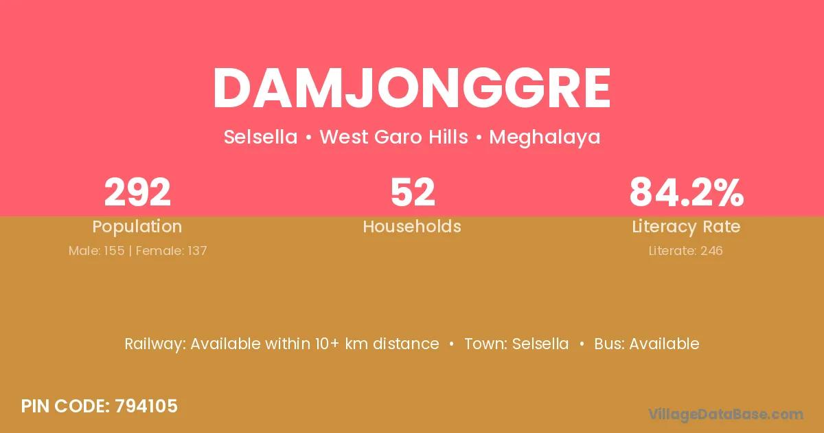Damjonggre village has a total population of 292 people, of which 155 are males and 137 are females.